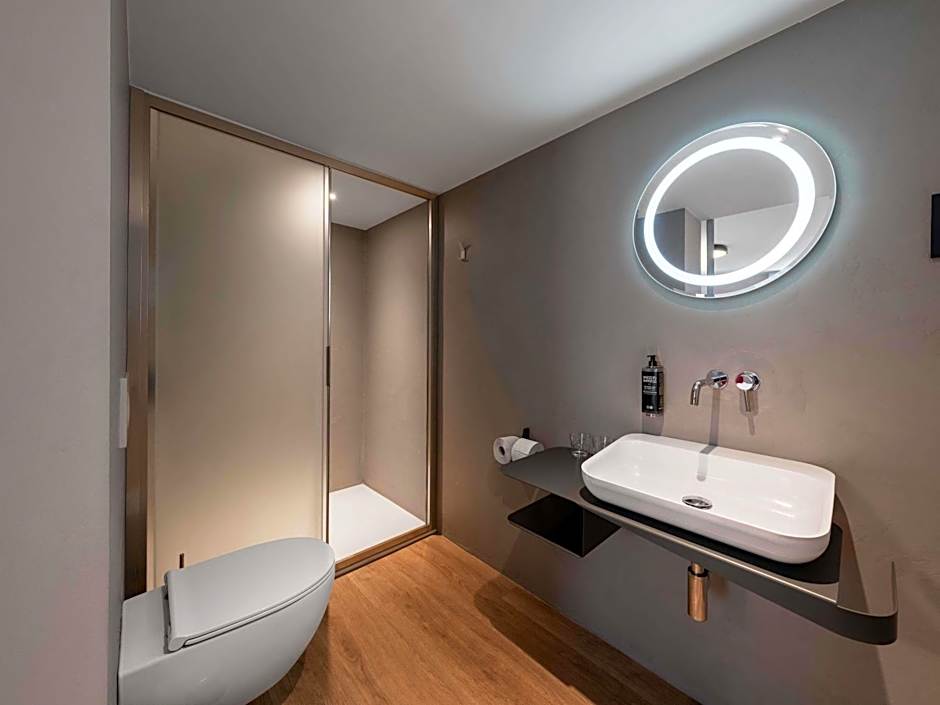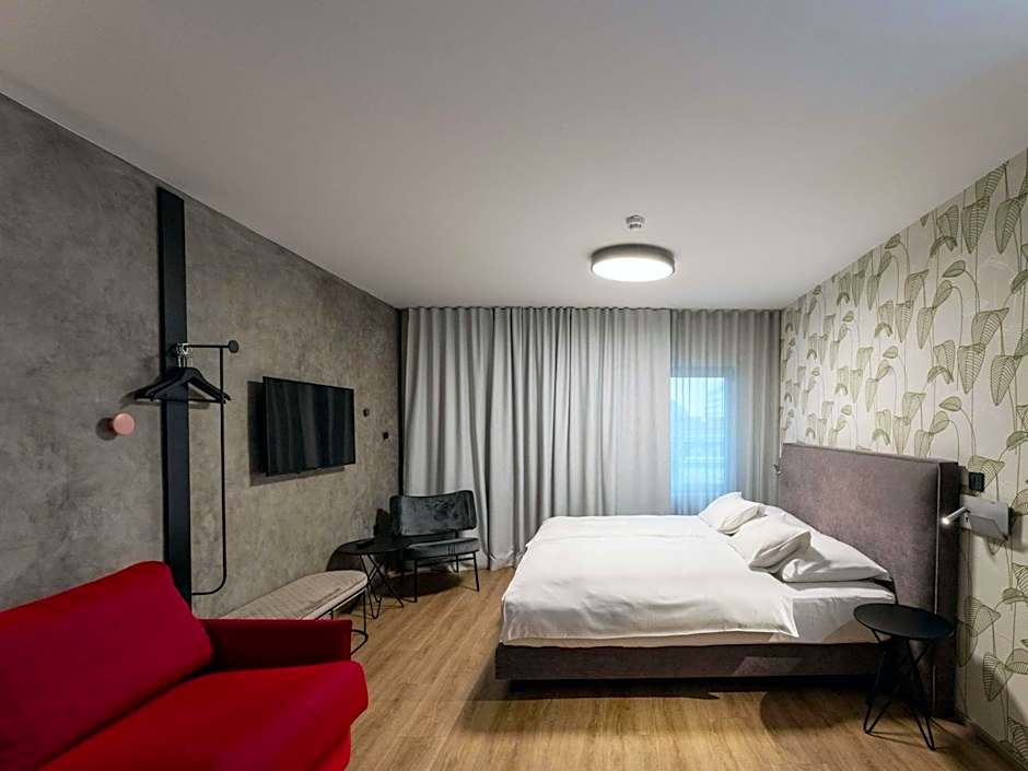 Designed with a sleek, urban aesthetic, the hotel's rooms feature murals inspired by Slovenian culture. Modern comforts include plush seating areas, smart TVs, and private bathrooms with rainfall showers, complimentary toiletries, and hairdryers.